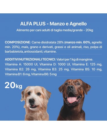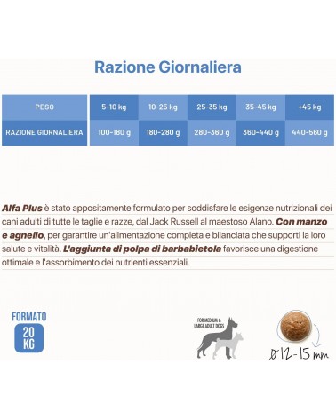 Alfa Plus è stato appositamente formulato per soddisfare le esigenze nutrizionali dei cani adulti di tutte le taglie e razze, dal Jack Russell al maestoso Alano. Con manzo e agnello, per garantire un'alimentazione completa e bilanciata che supporti la loro salute e vitalità. L'aggiunta di polpa di barbabietola favorisce una digestione ottimale e l'assorbimento dei nutrienti essenziali.