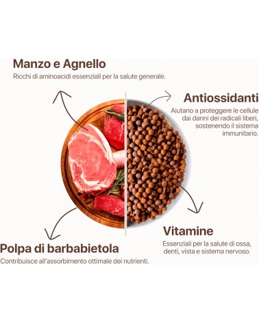 - Carne disidratata 28% (manzo min. 60%, agnello min. 20%), mais, grano e derivati, grassi e oli animali, riso, polpa di barbabietola, antiossidanti, vitamine.